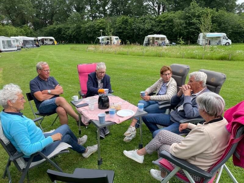 Zaterdag 8 juni Dinie en Bennie vertrekken al om 9 uur zij zijn er vandaag niet bij hebben een feestje en omdat het allemaal zo dicht bij is zij sluiten zondag weer aan. Om 11 uur vertrek ik als eerste en merk dat de rit te snel verloopt want we mogen pas na 13 uur aankomen. Bij Zwolle kom ik nog in een file maar bij de afslag naar de camping is er een goede mogelijkheid om te parkeren en nadat ik gestopt ben komen de eersten al binnen 5 minuten aan. Met Jan en Ine spreek ik de regie af en ga dan 5 minuten voor 13 uur naar de camping en juist bij aankomst begint het te regen en met boerin Dora nemen we de eerste zaken door, en roep ik de anderen op om te komen. En na een uurtje zijn de meesten weer goed geïnstalleerd. Lidy, Ine, Johan en Jan willen weer kilometers maken en gaan er weer op uit met de anderen genieten we van een borrel op een beschut plekje. Ik heb zelf veel pin van een bilspier ik heb mij verstapt bij het aanspannen van de voortent. Maak mij warme eten klaar en